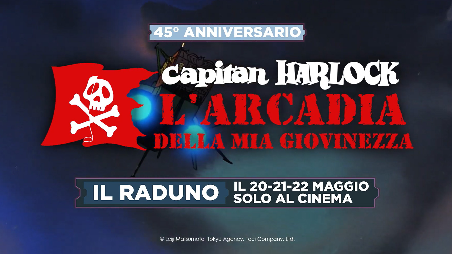 È il 9 aprile del 1979 quando il pubblico italiano "incontra" per la prima volta il personaggio Capitan Harlock dell'animazione giapponese in una serie tv. 45 anni dopo, il pirata dello spazio creato dalla fantasia di Leiji Matsumoto torna al cinema con Capitan Harlock. L'arcadia Della Mia Giovinezza, l'anime che narra la giovinezza del corsaro. L'evento speciale è la più grande reunion al cinema dei fan di Capitan Harlock, pensata per festeggiare l'anniversario in compagnia dei personaggi storici della serie (da Tochiro a Emeraldas passando per Mayu). L'appuntamento nelle sale è per il 20, 21, 22 maggio grazie alla Stagione degli Anime al Cinema 2024, un progetto di Nexo Digital distribuito in collaborazione con Yamato Video.